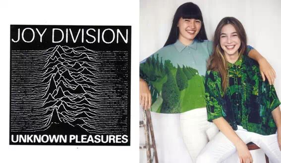 ▼设计师提到的《Unknown Pleasures》专辑的封面(左图)和Sarah Richards的纺织图案(右图)
