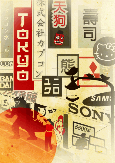 在这些专题中,最值得一提的是东京专题,专题征集的全是gif动态图片,设计师们用色彩斑斓的霓虹,秀色可餐的女优,动感十足的漫画,或秀气或粗犷的汉字诉说着艺术家眼中不一样的迷幻东京……