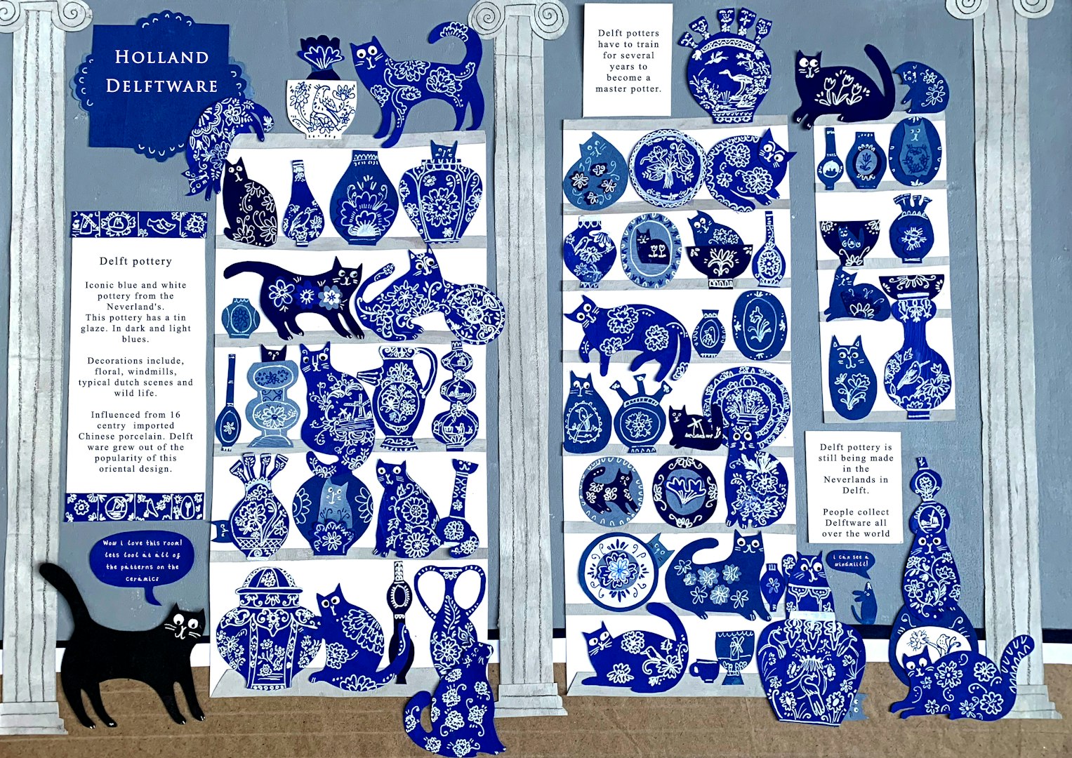 插画介绍:在C&M博物馆中跟随一只友好的黑猫,探索和了解古代手工艺品和文物。