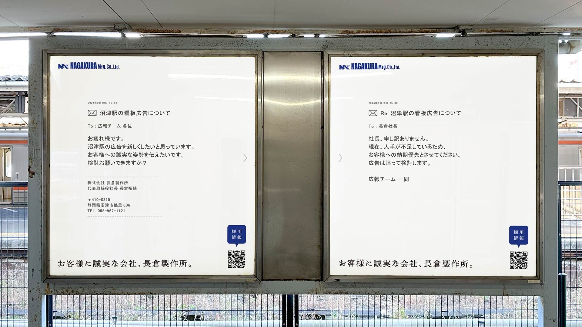 长仓制作所是一家从事冷锻的日本公司(“冷锻”是对常温金属材料施加压力进行成形的塑性加工之一。看不懂也没关系,往下读就知道,其实他们自己也没想好怎么让大家明白他们在做啥)。9月10日,他们在沼津站常规线检票口内投放了两张户外广告。没有岗位说明、没有公司介绍,而是用短短两篇内部邮件展现了所有信息。