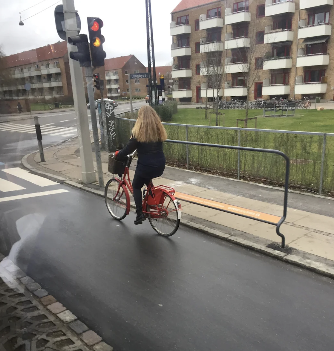 值得一学的,还有红绿灯等待处的骑行踏板。为了解决骑行者单脚踮地保持平衡的困扰,他们在道路栏杆的底部、骑行者脚尖恰好碰到的位置安装了金属踏板,为其提供一个稳定省力的支点。当绿灯亮起时,骑行者也能更轻松地借力起步。