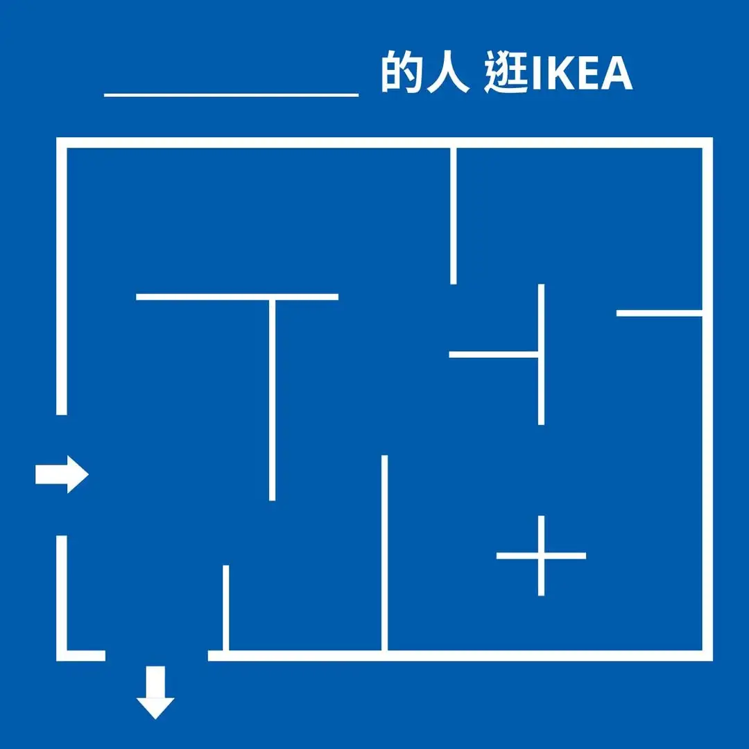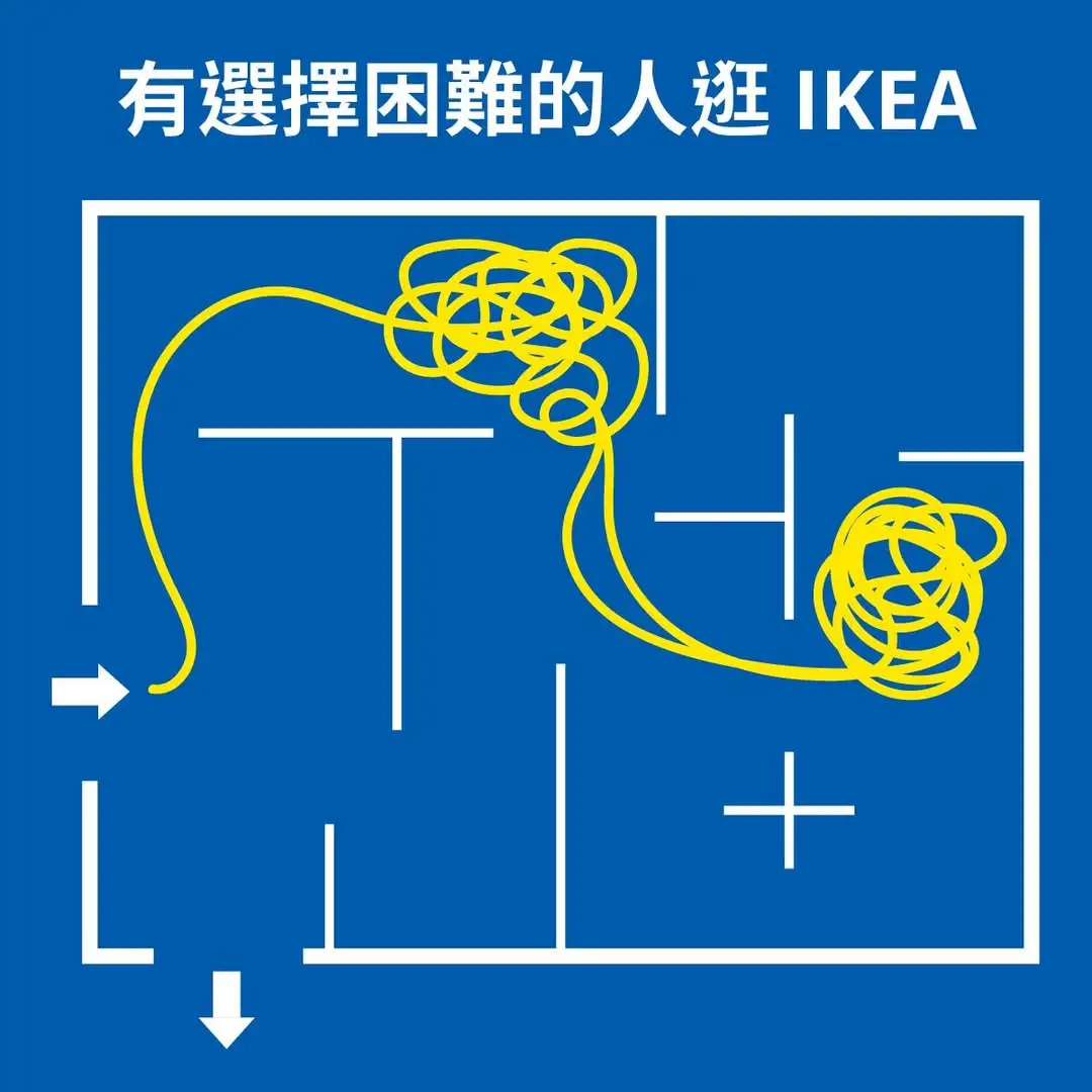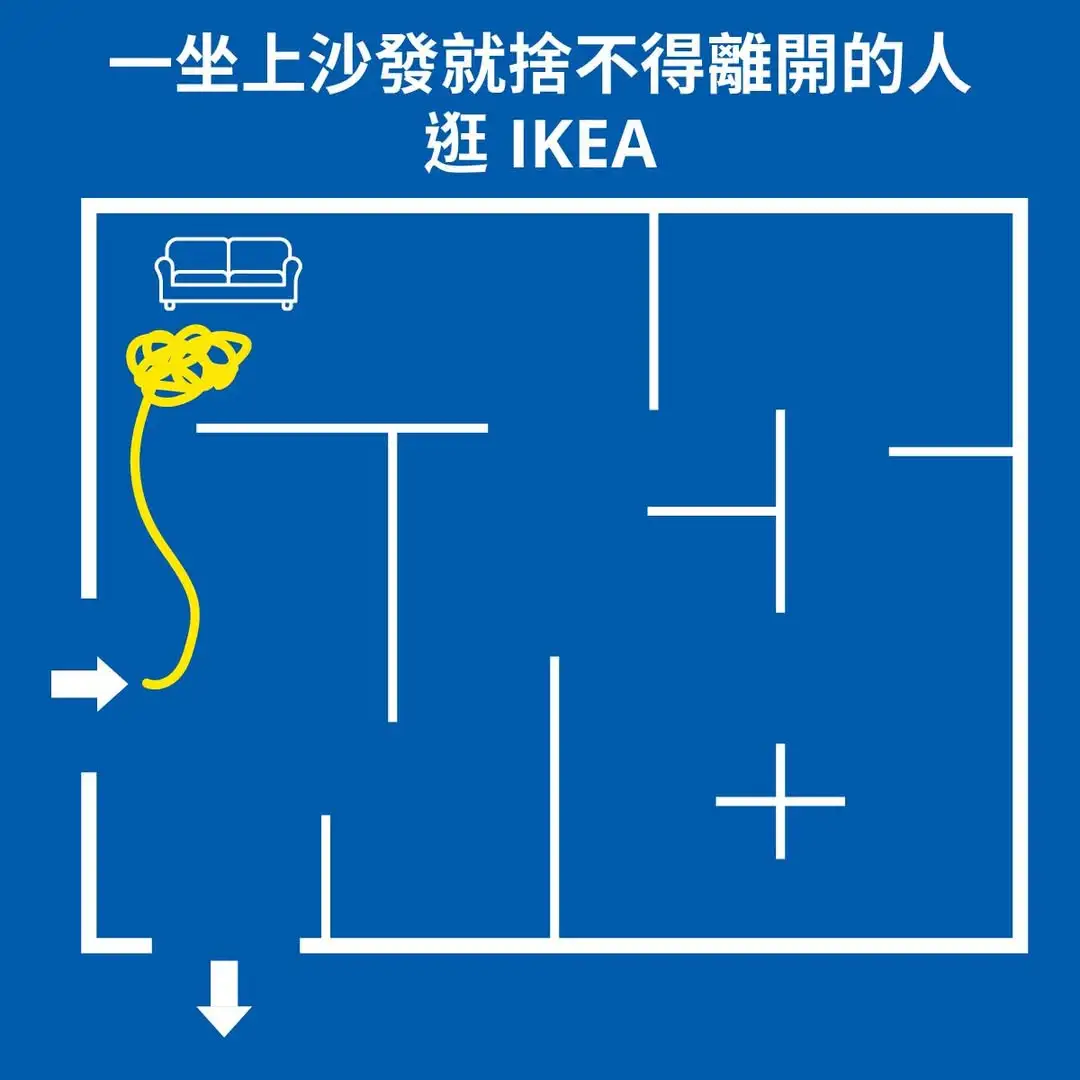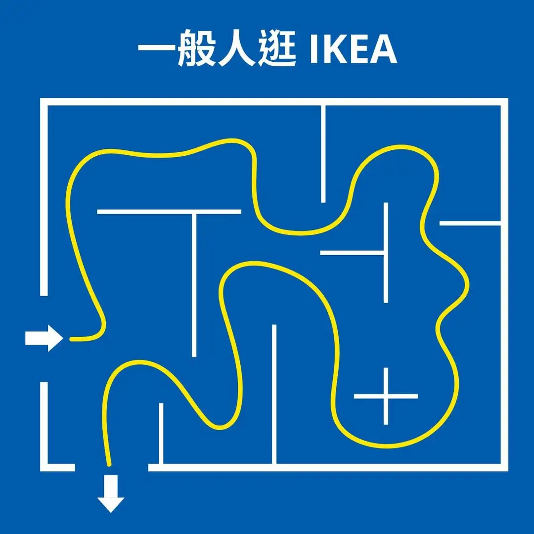 23年底,中国台湾宜家发布了一组逛宜家路线图,它描绘了抱着不同目的来宜家的人的行为路线:有在沙发区沦陷就不再前行的人,有在每个货架前反复徘徊的选择困难患者,也有目标极其明确、只为冰淇淋而来,完成交易就转身离开的人。