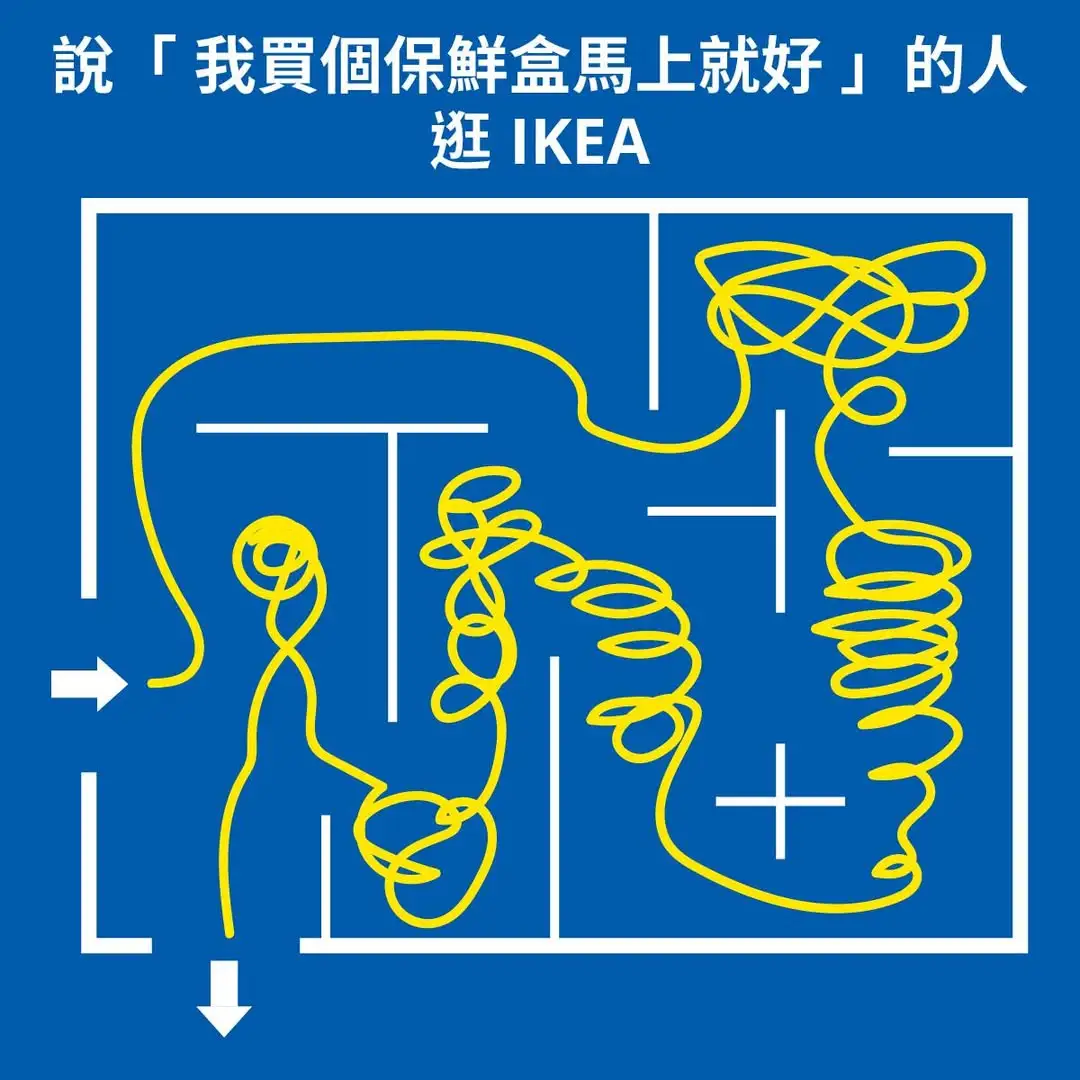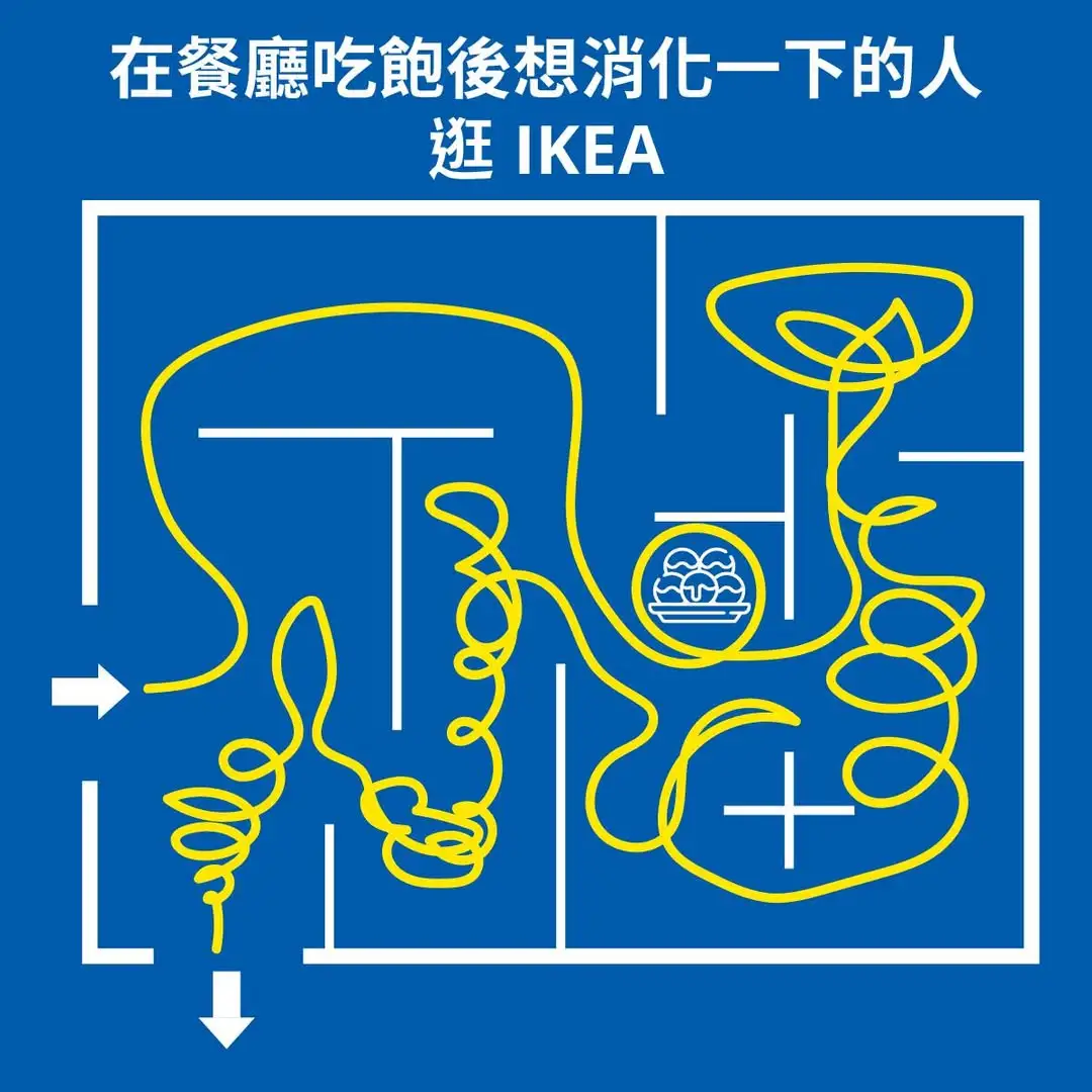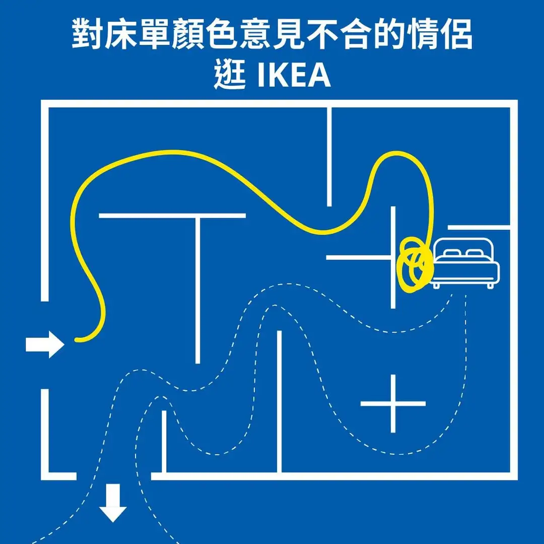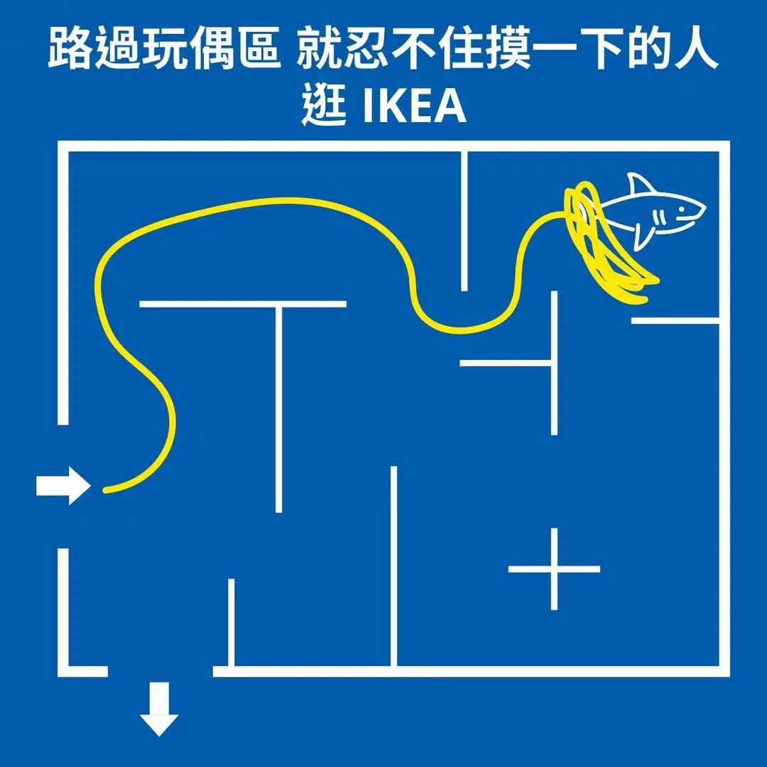 23年底,中国台湾宜家发布了一组逛宜家路线图,它描绘了抱着不同目的来宜家的人的行为路线:有在沙发区沦陷就不再前行的人,有在每个货架前反复徘徊的选择困难患者,也有目标极其明确、只为冰淇淋而来,完成交易就转身离开的人。