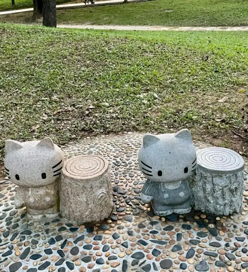 首先跟随网友的步伐,来到树木园附近的动物石凳。除了Kitty,还有米奇、天鹅等各种造型的石凳,有些依稀是记忆中的模样,有些却是第一次发现。接着,按照攻略导航至水库环线,又解锁了一条宛如绿野仙踪的榕树大道。