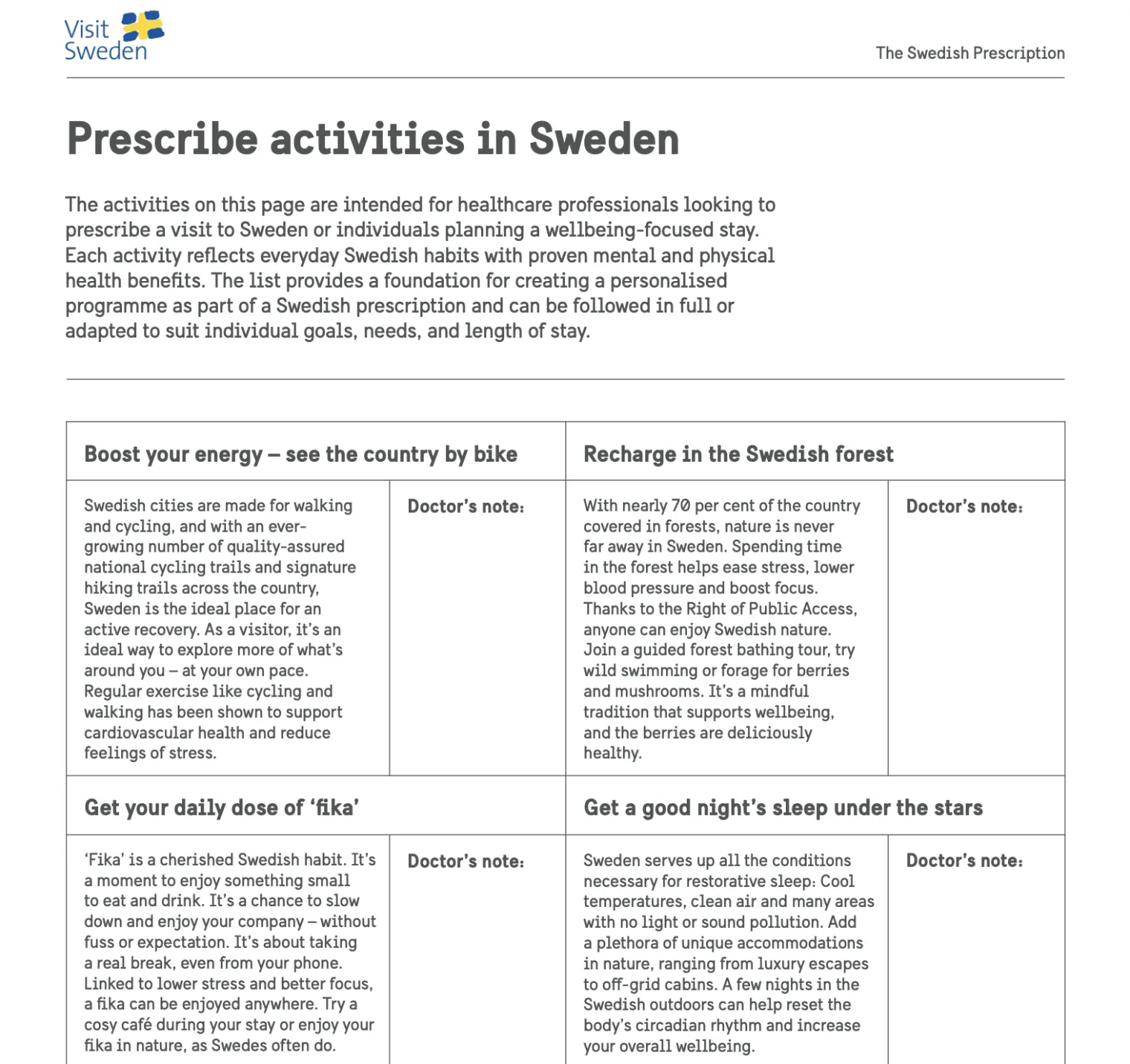 打开Visit Sweden网站,点击“GET YOUR PRESCRIPTION”按钮,还能获得一份pdf格式的电子处方——点开一看,里面用医生开具处方单的形式,像模像样地列举出瑞典最具影响力的旅游资源:凉爽气候、丰富植被、死亡金属(是的,Visit Sweden称研究表明死亡金属这类极端曲风有助于消解愤怒)……