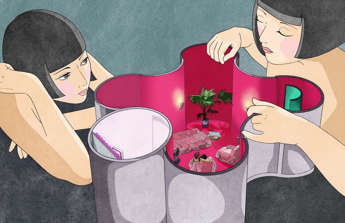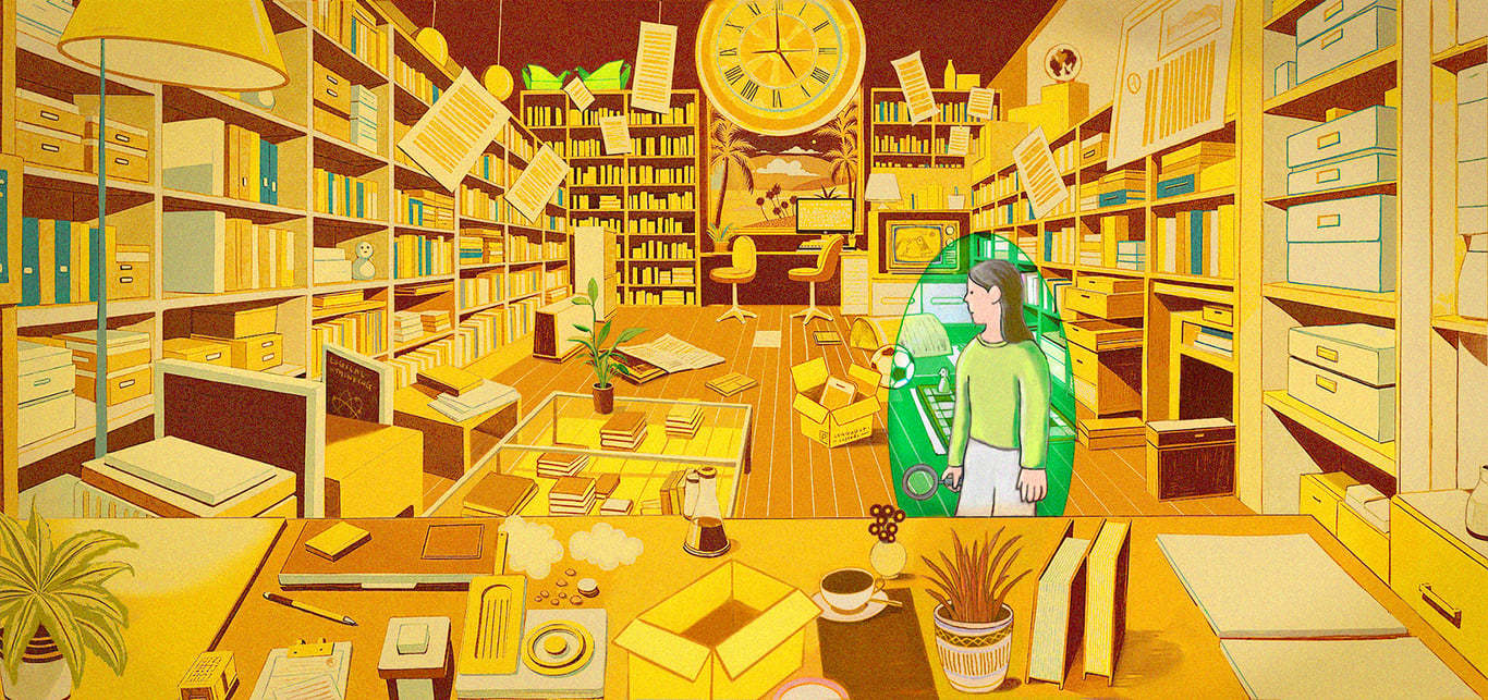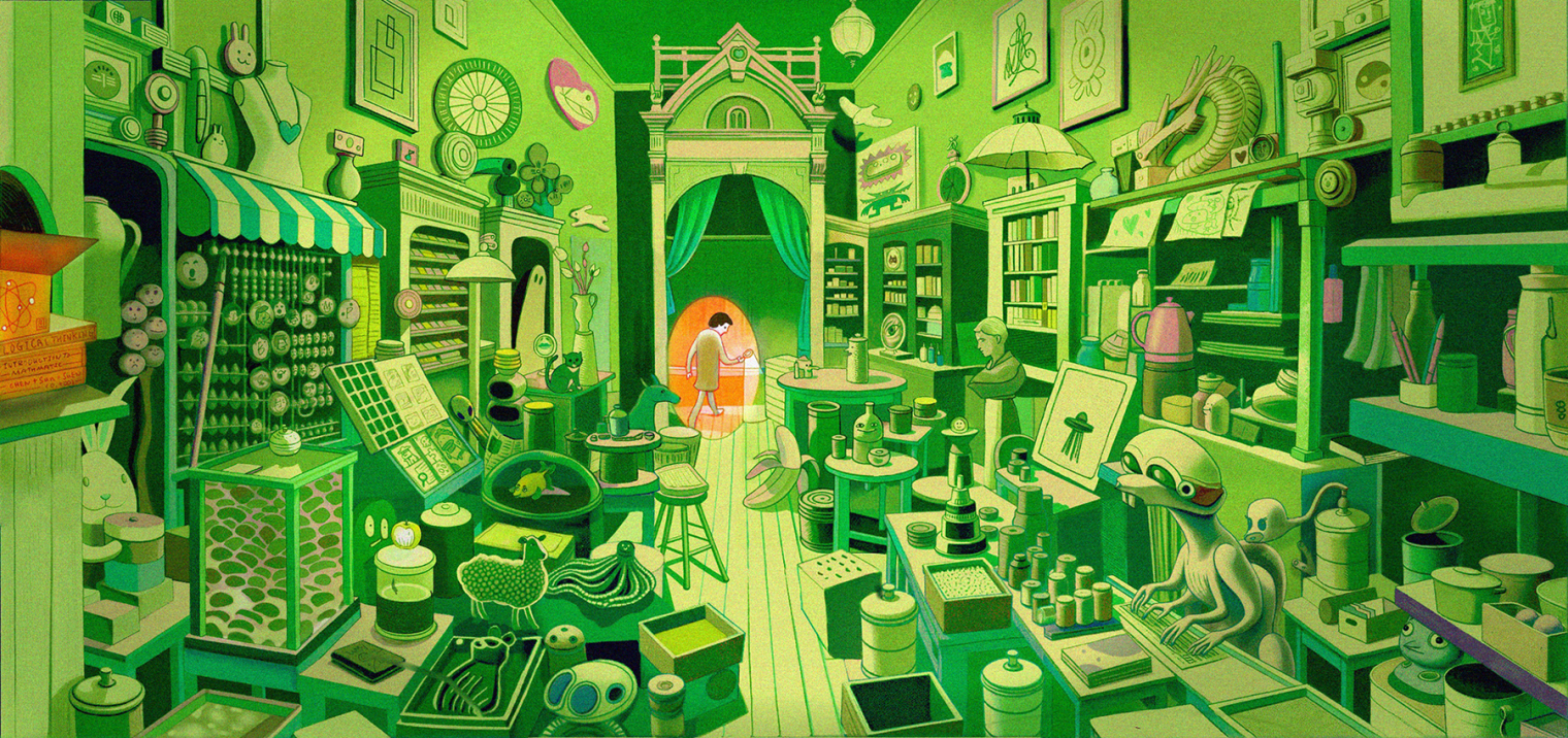 她绘制了两个分属于二人的房间,绿色的属于INFP的自己,黄色则属于ISTP型人格的丈夫。他们分别走进彼此的房间,并拿着放大镜,试图从中发现一两件属于自己的东西。