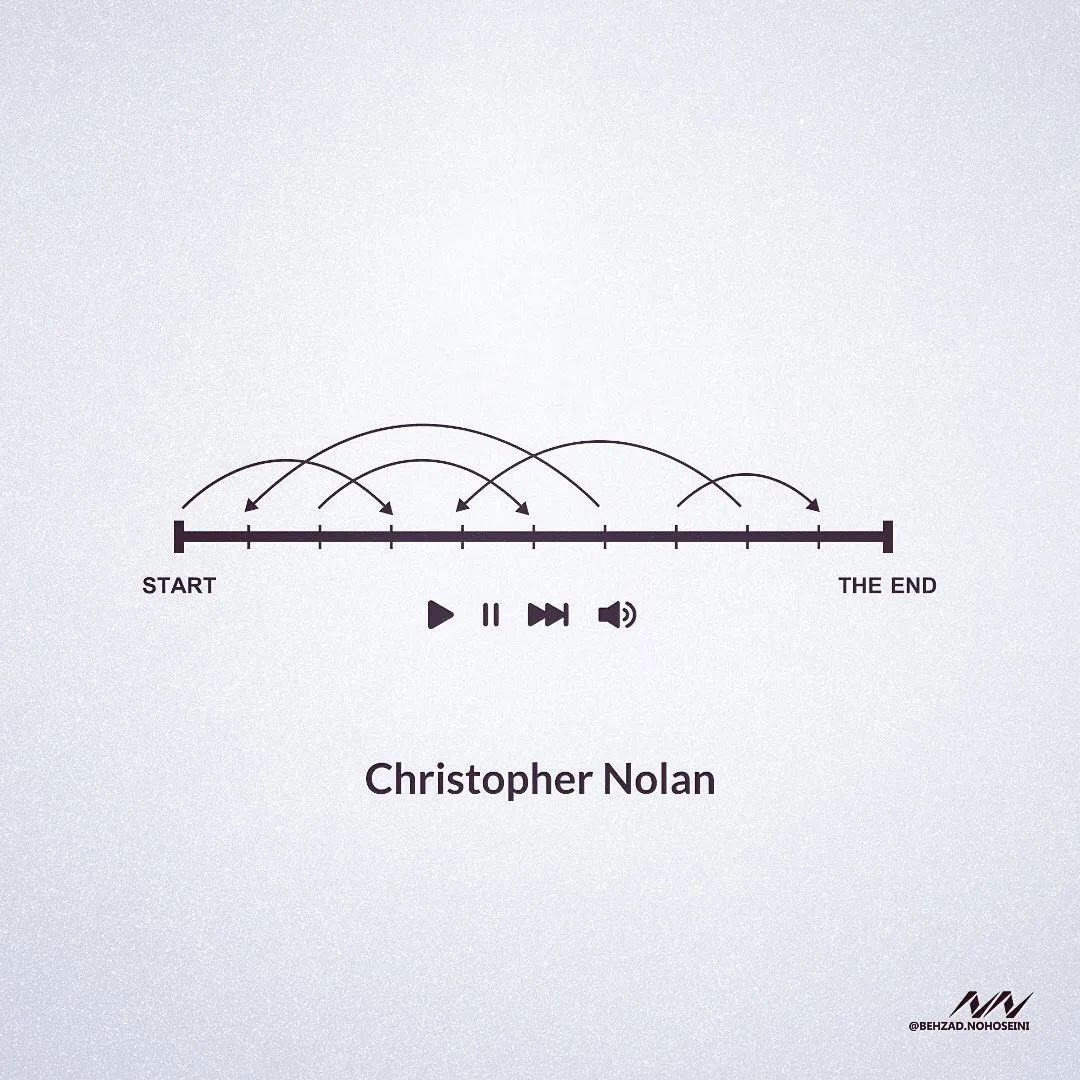 在Behzad给世界名导们绘制这一系列作品中,还有导演克里斯托弗·诺兰。他最爱在电影中使用跳跃的时空叙事、让人摸不着头脑——