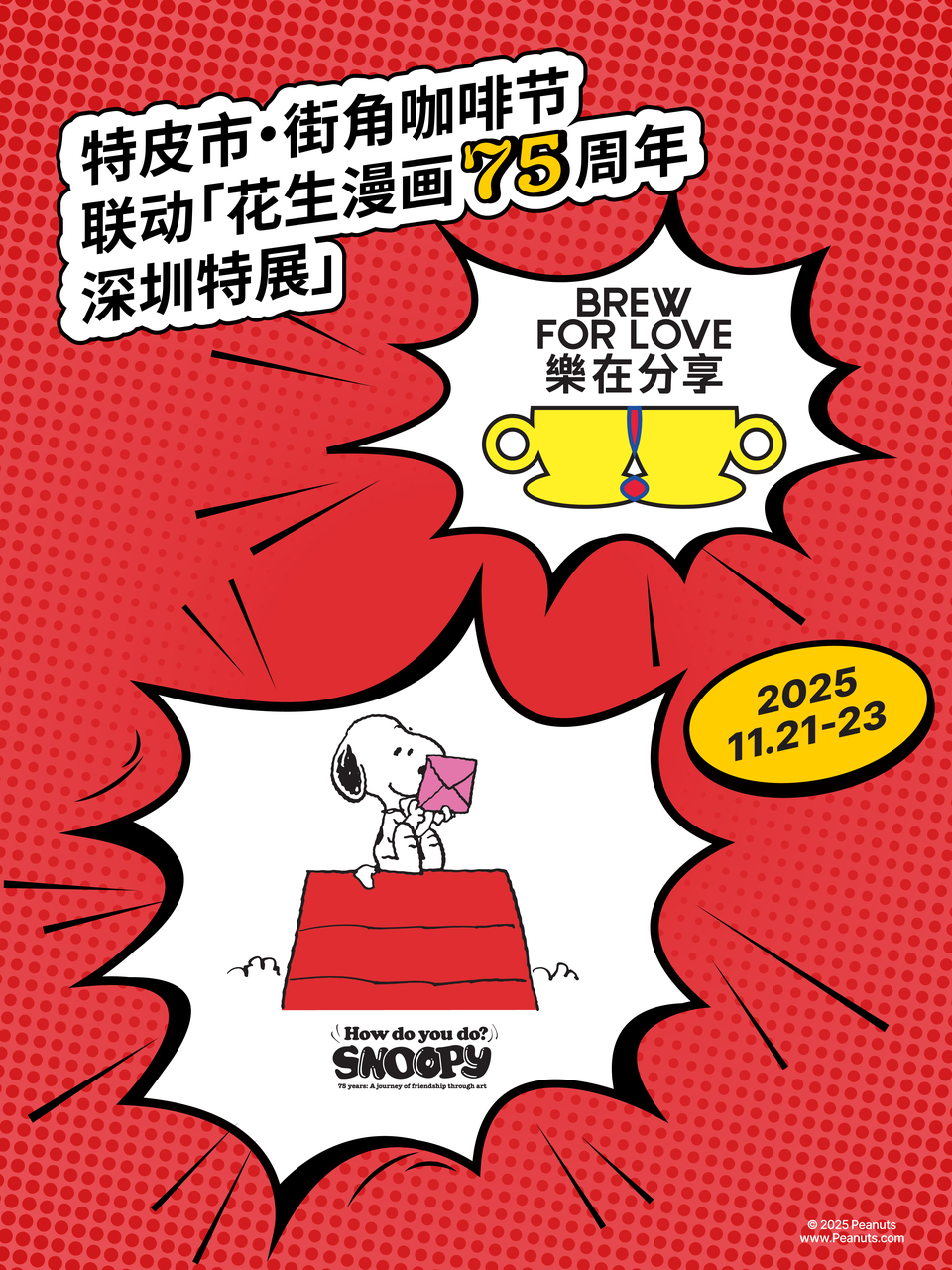 今年,特皮市·街角咖啡节与「How Do You Do, Snoopy?花生漫画75周年深圳特展」特别联动,邀请你再次相遇。用一杯咖啡的时间,感受《花生漫画》带来的温暖。