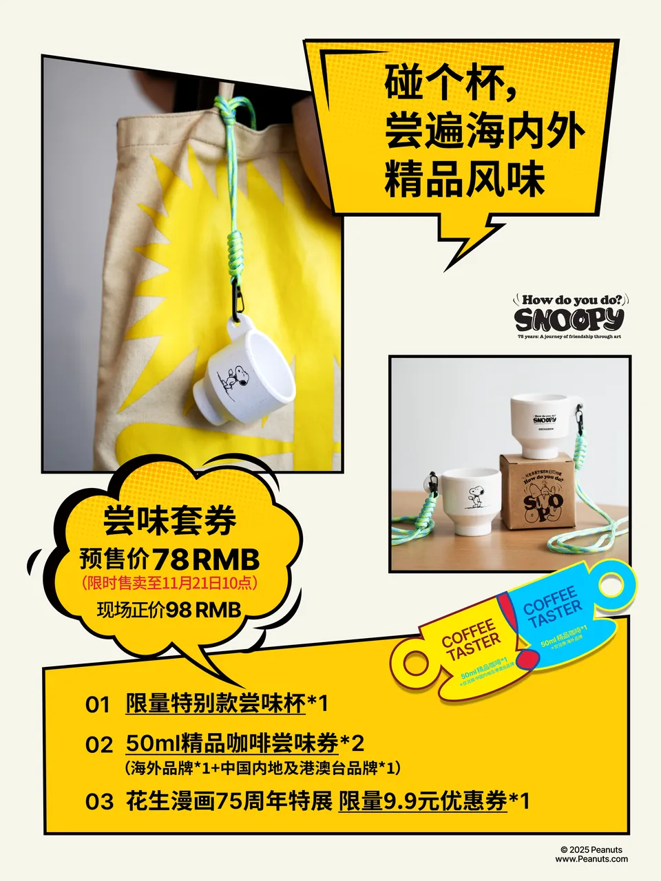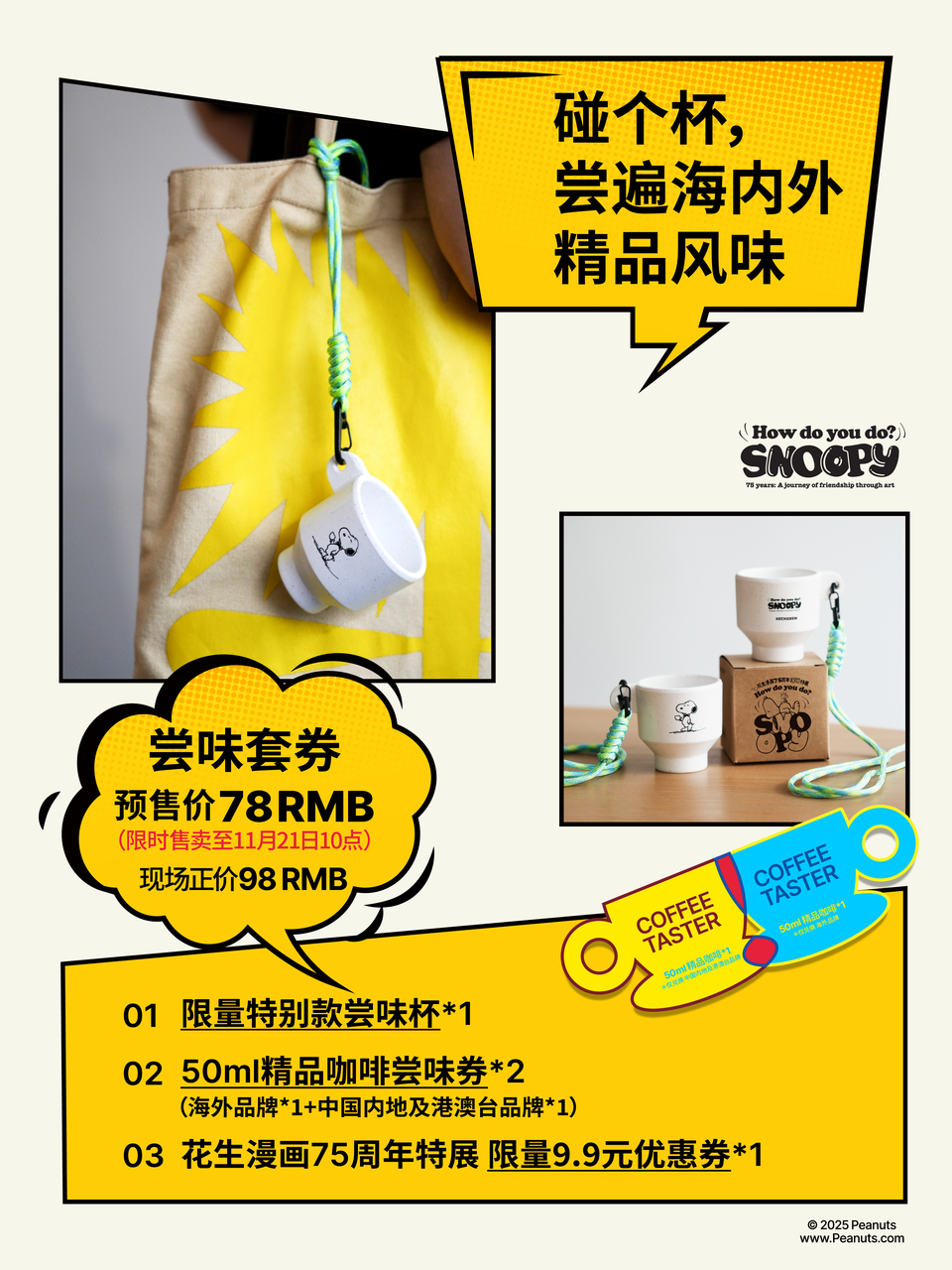 咖啡节推出尝味套券,内含Snoopy限量特别款尝味杯及两张尝味券,让你一次性品尝亚洲多城的精品咖啡。BUY套券,还可享展览门票立减9.9元优惠。