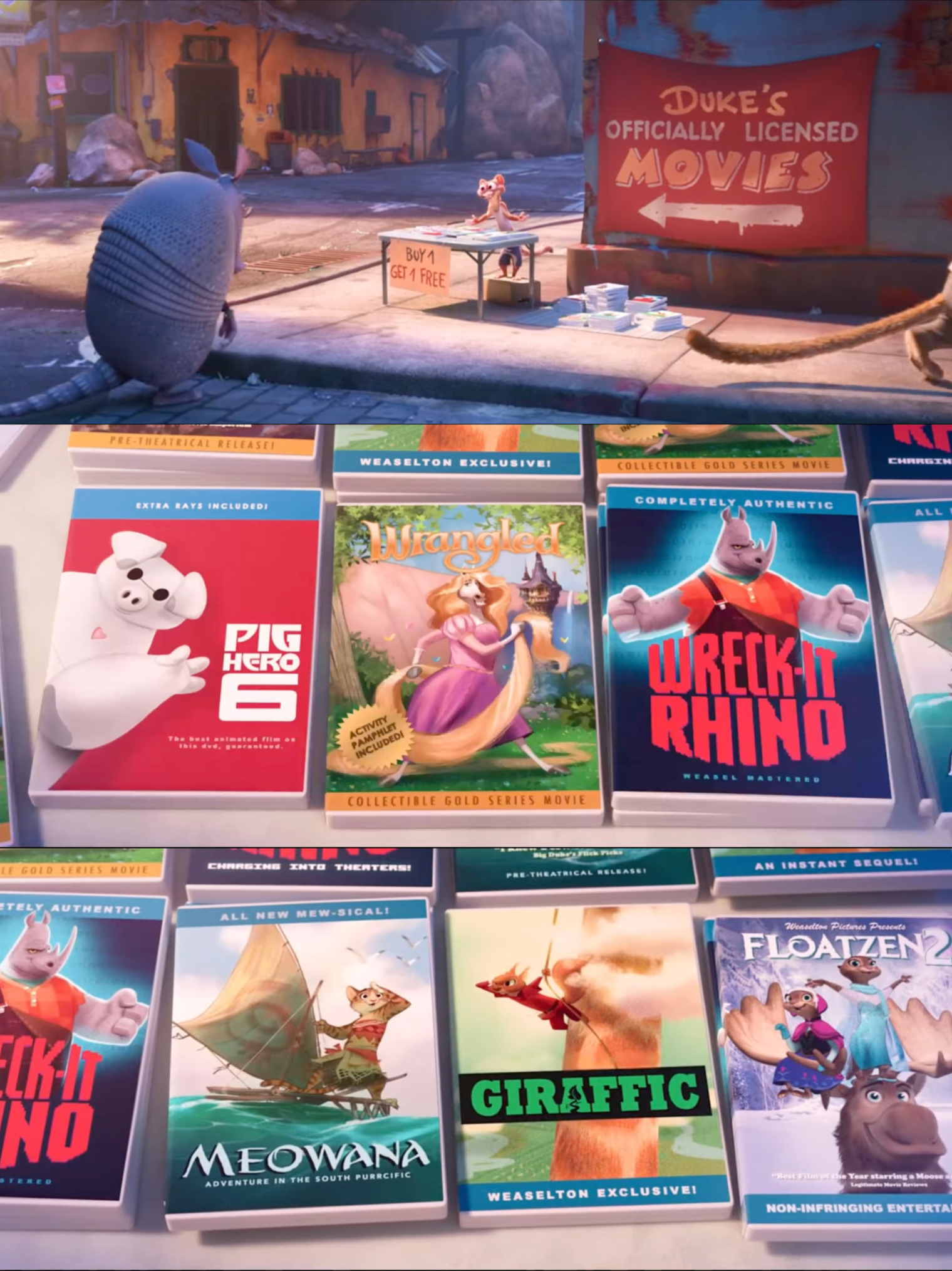 其实细心的朋友或许还记得,早在第一部影片中,盗版光碟摊上就暗藏了类似的“片中片”彩蛋。只不过当时的长发公主还是夏奇羊,兼职演戏的动物市民也不止上述这些。