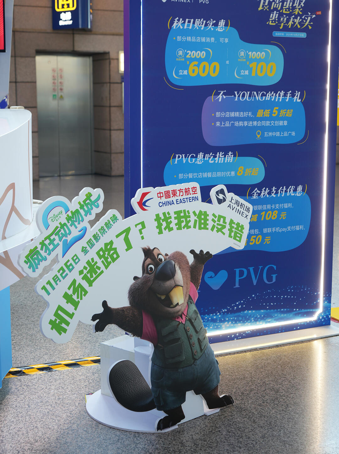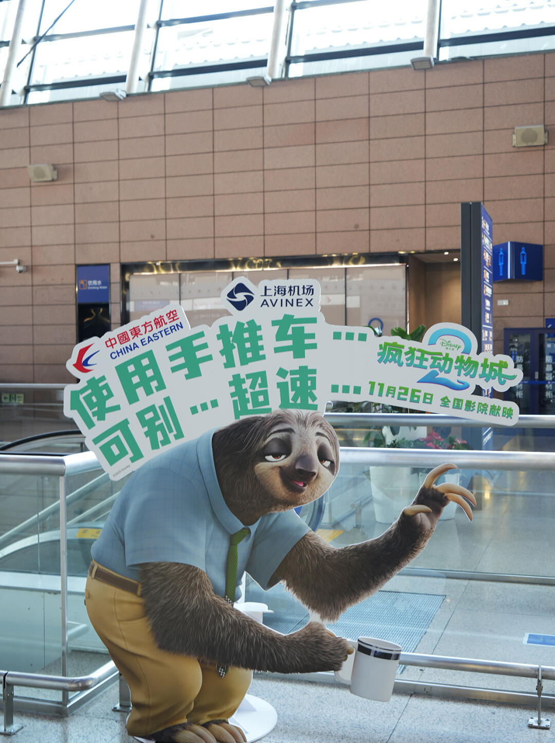 但如果你没空专门前往商超广场打卡,也有办法轻松集齐九宫格发朋友圈。当你在浦东机场候机的时候,可能就会偶遇树獭“闪电”,告诉你“使用手推车...可别...超速...”。