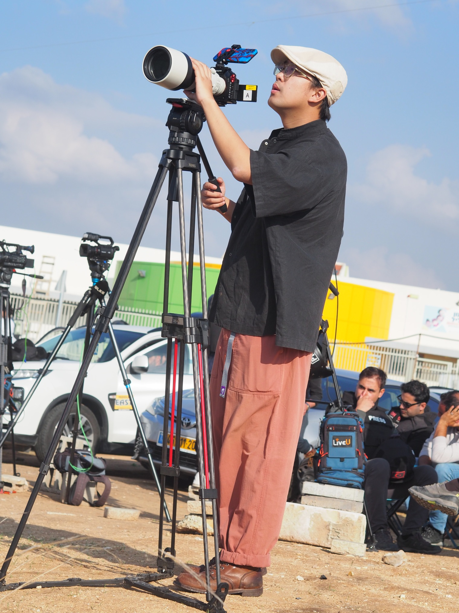 纪实拍摄是一门掌握时机的艺术,它需要获取信息的眼睛、快速决策的头脑和手眼合一的执行力。2023年10月,巴以再次爆发武装冲突,中东地区成为全球媒体关注的焦点,阎汁儿跟随团队前往冲突地区,拍摄《迦南孤儿》。他们在距离加沙(哈马斯控制的巴勒斯坦领地)最近的以色列小城斯德洛特拍下了被子弹打穿的钢构墙体,空无一人的街道,以及不远处加沙被炮弹袭击后轰然倒塌的建筑物。在特拉维夫,他们毫无准备地遭遇了6枚火箭弹空袭,人们寻找防空洞的慌乱时刻,阎汁儿用镜头记录下以色列人民在铁穹系统保护之下惊险又有些荒诞的生活实景。“当时根本没来得及想那些会让你害怕的可能性,这种画面很难遇到,就很想拍下来。而且我们可能从心里相信它会拦截成功,算是赌了一下。”