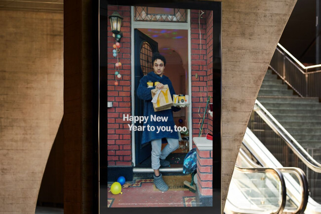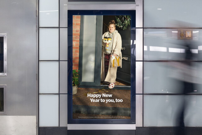 2026年的第一天,英国麦当劳发布了一组平面海报。画面中,睡眼惺忪的顾客穿着睡袍,迷迷糊糊地打开门接过麦当劳的袋子,而前一晚派对留下的气球、彩带还散落在地。每张海报都配以同一句文案“Happy New Year to you,too”(也祝你新年快乐),简单但明确,不精致但应景,还带着点调侃和俏皮。
