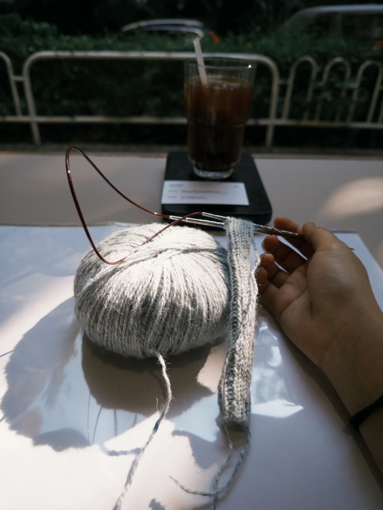 小o是大概一年前开始接触编织的。恰好在信息流里陆续刷到各种美丽成品,恰好身边有朋友在更早的时候入了坑。“出去玩的时候我说想学编织,就临时起意在咖啡厅点了外卖,用最基础的奶牛棉和竹棒针,朋友带着我做。”
