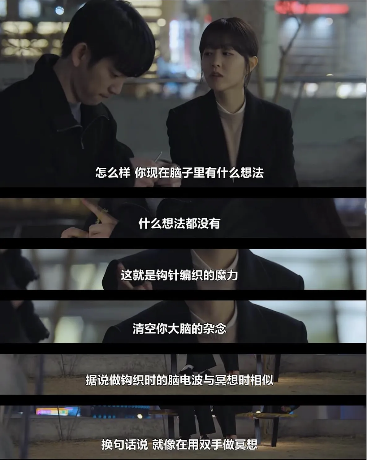 韩剧《未知的首尔》中,女主看到男主因为失业而消沉,便带他去市场买了毛线。“一针一针地织就能熬过一天,只要这样坚持下去,转机就会到来,就算没有转机,你还是能得到一个洗碗刷。”虽然是台词,但事实上,许多都市年轻人捡起钩织,就是为了给大脑来一场柔软的精神马杀鸡,或在激烈紧张的时刻,或是平日快节奏的高压生活中。因此,钩织也被称为“新型瑜伽”,或是“赛博冥想。”