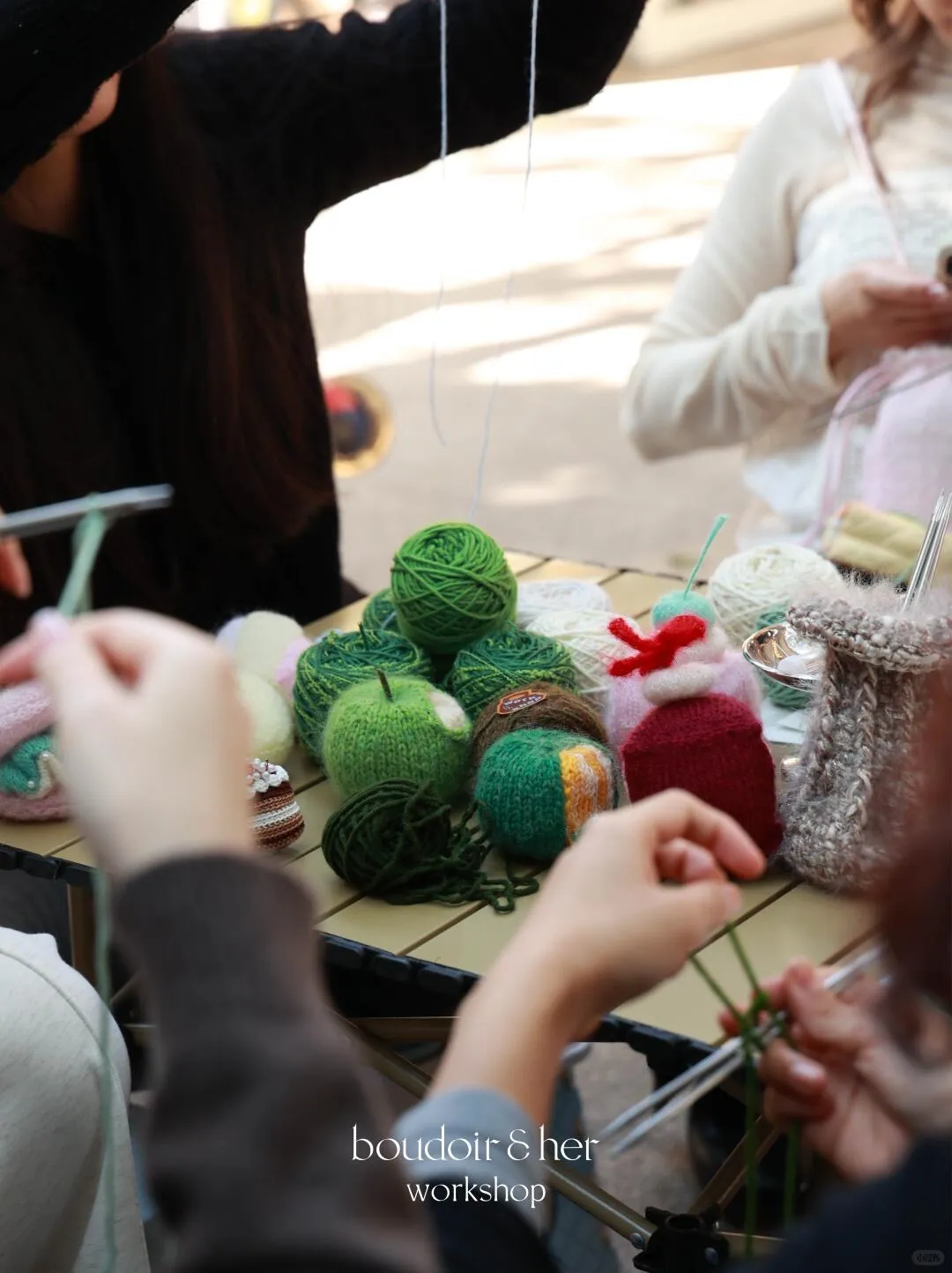 boudoirher workshop不她,是一家以纤维艺术为主的会客厅空间,上个月入驻了深圳LOFT53的smoomarket,开设棒针入门班、艺术家联名创作新年挂饰、diy串珠等不同类型的工作坊。课程费用从几十到几百不等,有编织老师或艺术家带练、提供工具材料包。这意味着即使你零基础、无装备,也能在几小时的沉浸式学习后带着成品回家。