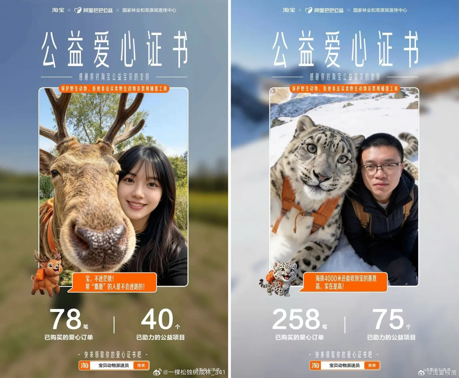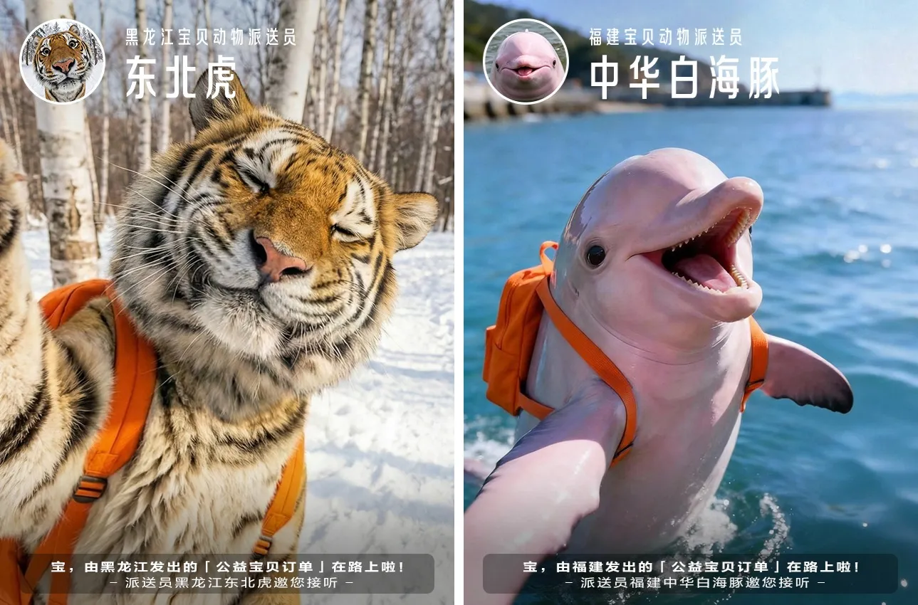 特别值得一提的是,ai技术加持下,这些可爱的派送员不光能“上门派件”,还可以与你合影留念:上传一张自己的照片,ai将自动生成一张你和对应的“宝贝动物派送员”的合照。这种有趣的方式,不仅带来了更沉浸的新鲜体验,更重要的事,让消费者和这些野生动物间的联系,从一笔笔捐赠“账目”变成了一段段可爱的“关系”,也让公益不再只是单向付出,而是成了一次双向的、有趣有情感的互动。