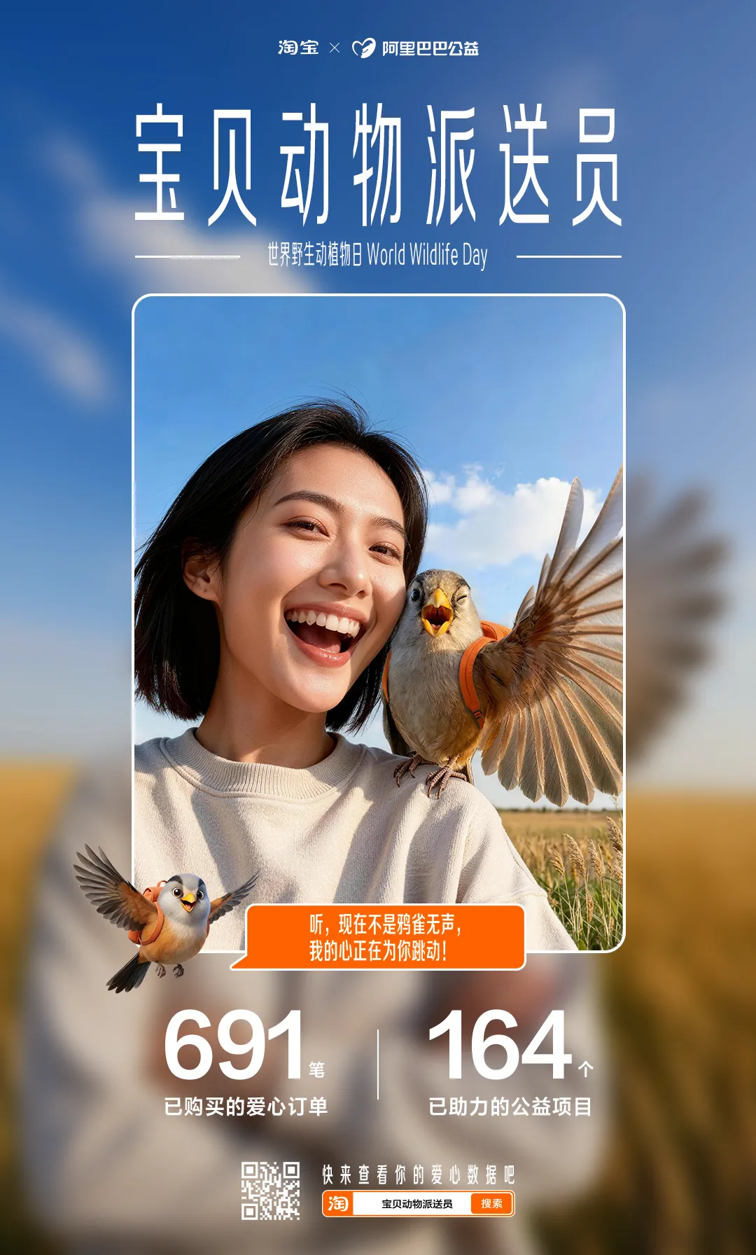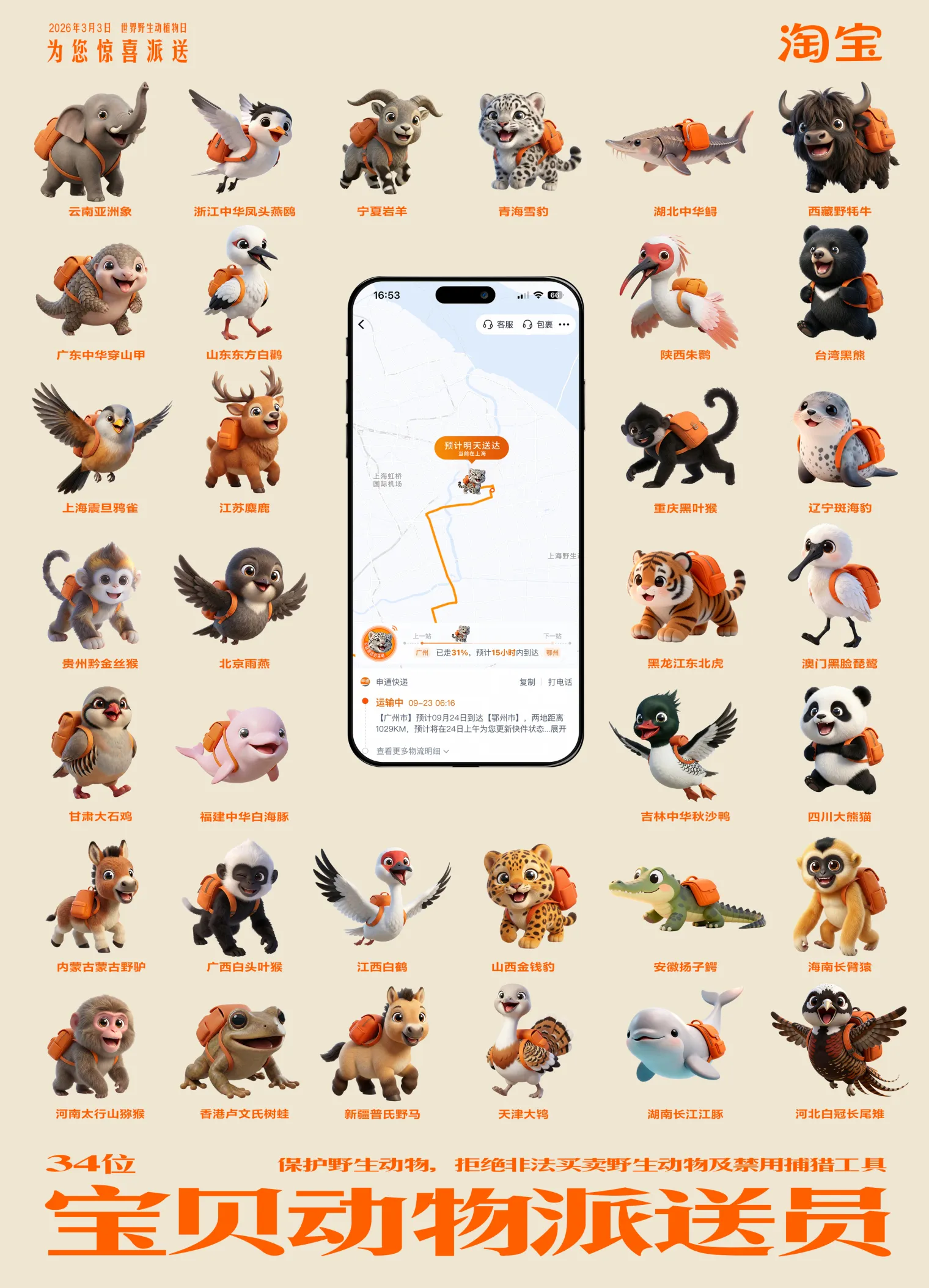 持续20年,累计超600亿笔爱心订单。这次,淘宝让来自全国34个省级行政区的34个野生动物“上任”派送员,让过去二十年里点滴善意累计起来的庞大数字,让每位曾经参与其中的消费者、品牌,有了一次被看见、被知道的机会。
