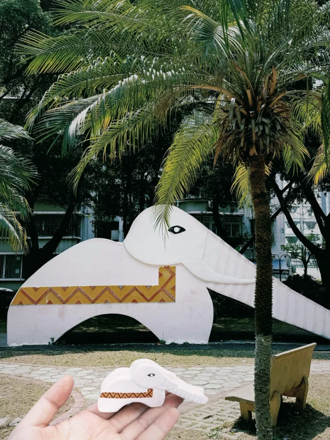 在深圳南山区华联花园草坪上被椰子树环绕的巨大白色大象滑梯,现在仍然是大人小孩抢着滑,还被设计成3d打印玩具。