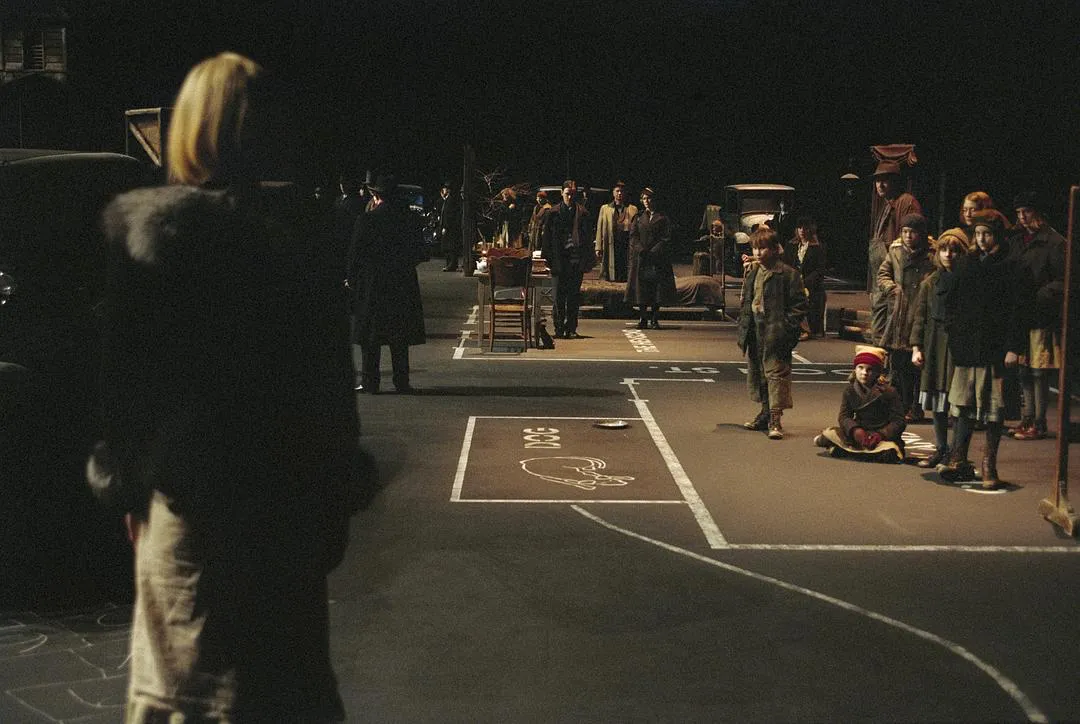 有在影院放映的话剧,同样有像话剧一样的电影。丹麦导演拉斯·冯·提尔执导的《狗镇》,就将电影“舞台化”,采用“简陋”的布景和手持DV拍摄。搭木头表示矿洞,堆几块石头代表山峰,在地上用粉笔画出街道和房屋,让演员在“线条”上进行表演,试图通过做减法,获得戏剧般的情绪感染力。续作《曼德勒》也是如此。
