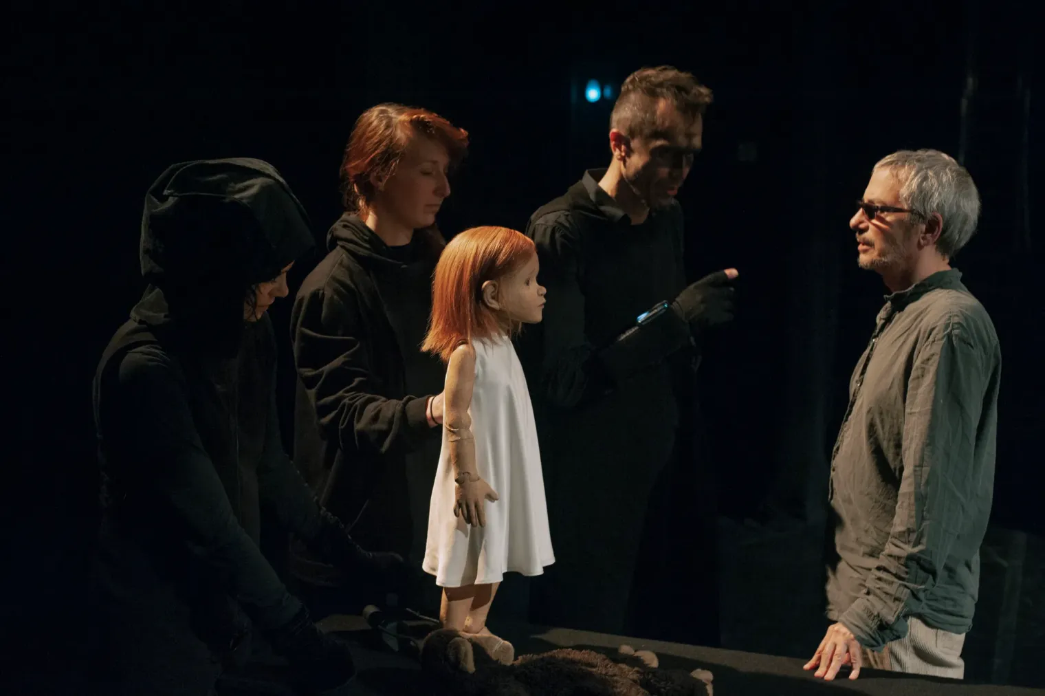前几年获得戛纳电影节最佳导演奖的《安妮特》,同样融入了许多戏剧元素。女儿安妮特一直由一只木偶扮演,假关节和假发清晰可见,以此寓意她被操控的、傀儡般的处境。作为歌舞片,演员直接将台词演唱出来,且有意识对着摄像机表演。甚至影片开头就是导演卡拉克斯和主演们从录音室走到街头、准备表演的长镜头。一系列操作只为了告诉你:这就是场演出,你只用专注于它想表达什么。