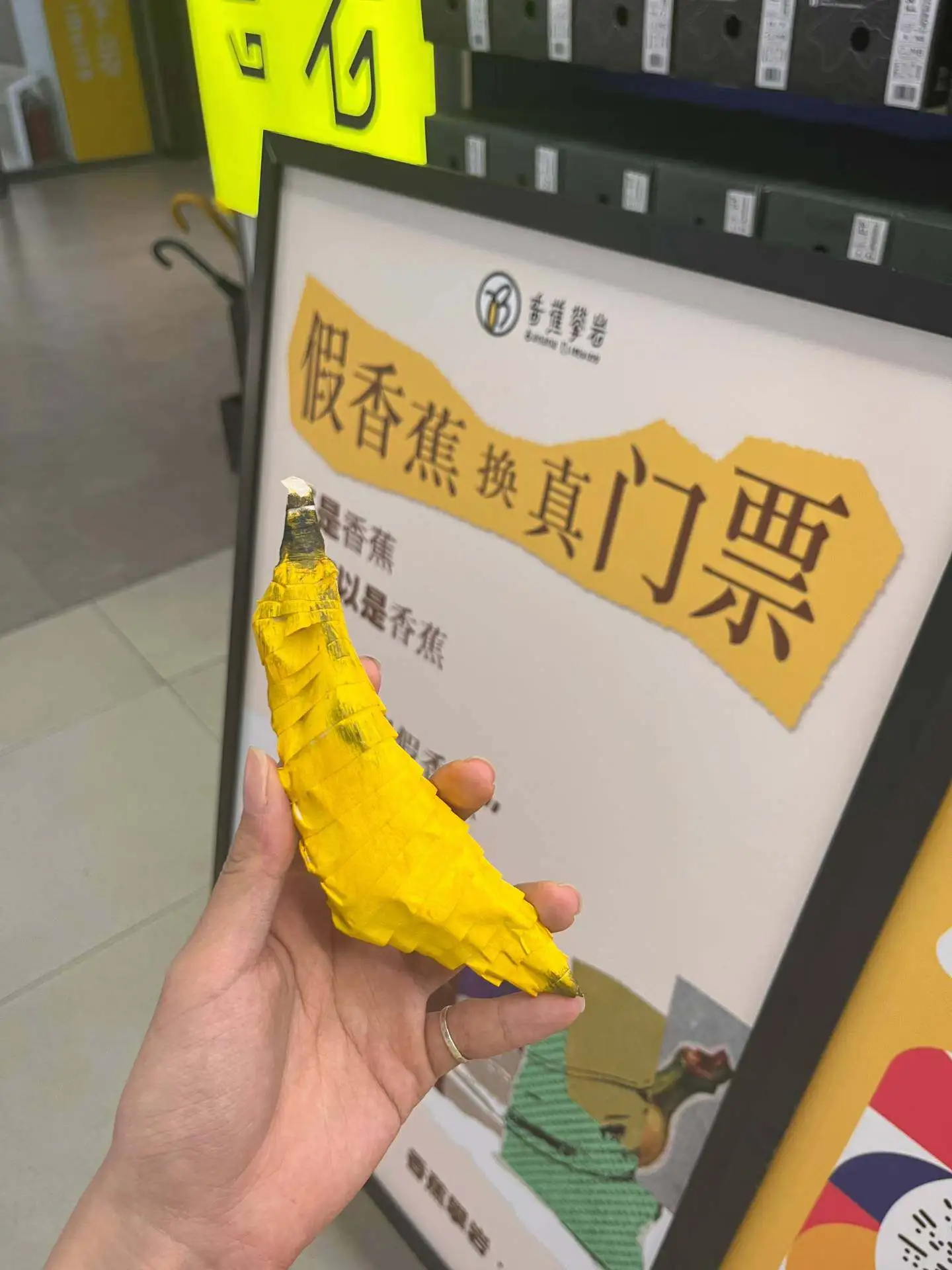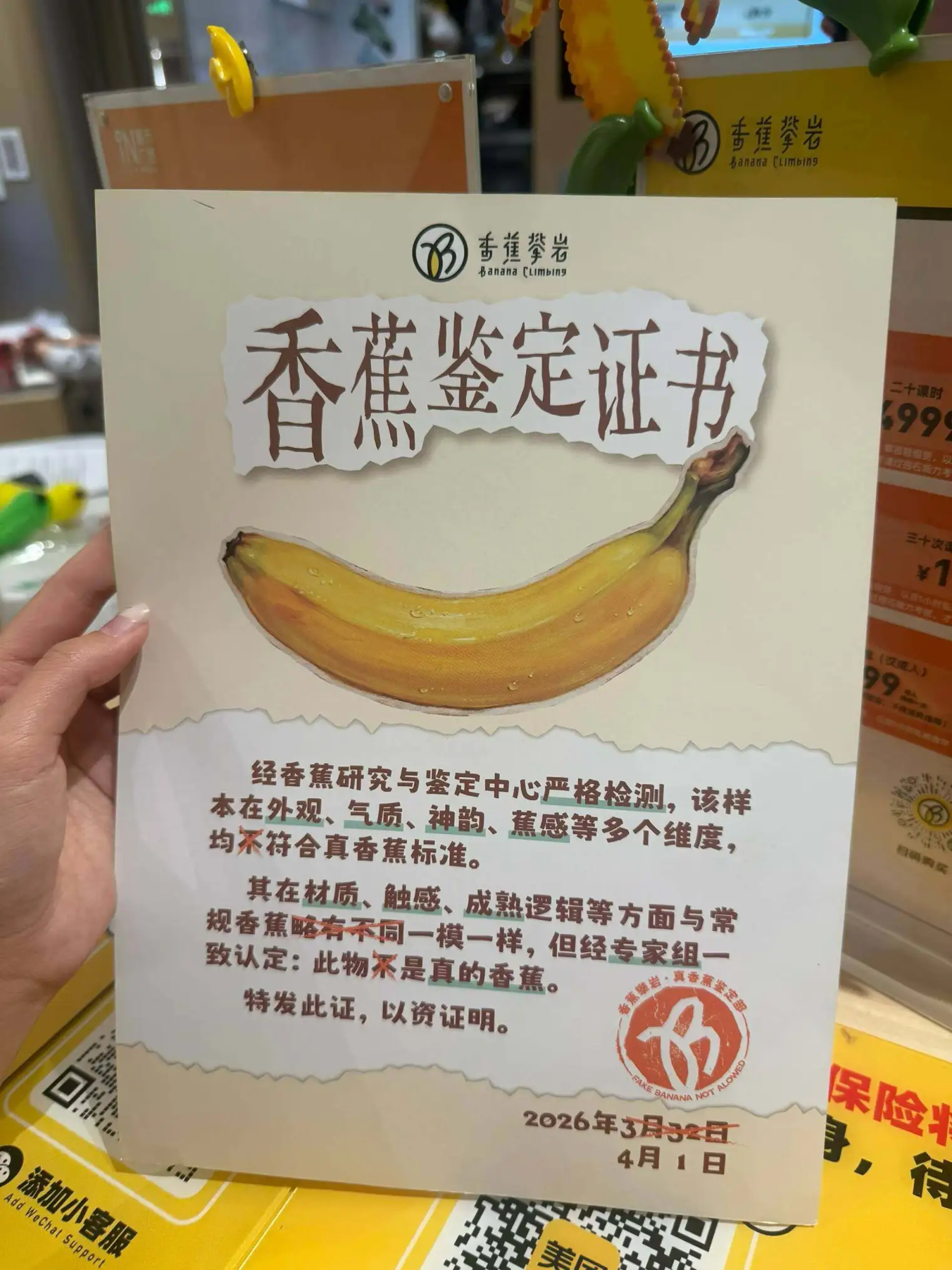 几天前,“香蕉攀岩”在社交媒体上发布了愚人节的限定活动:用一件与香蕉相关的周边产品,兑换一张当日攀岩门票。消息一出,攀岩爱好者们蠢蠢欲动,有人在家里翻箱倒柜,找出香蕉造型的陈年物件,或是直接上手,用扭扭棒、拼豆手搓出一条“假香蕉”。门店也给足了顾客们仪式感,只要香蕉“达标”,不仅有门票,还能获得一张纸质的“香蕉鉴定证书”。