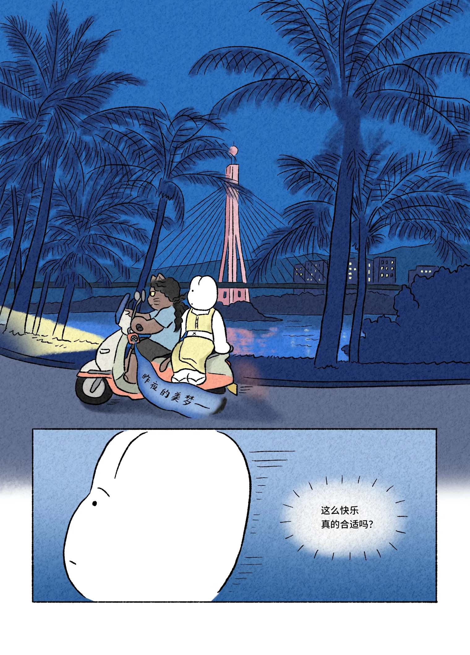 陆冉用自嘲消解精神内耗,当把拧巴的时刻画出来,笑一笑,这件事就算过去了。拟泥nini的漫画虽是治愈的糖果色,却包裹着许多痛苦的东西,她用这些故事让读者体会到“世界上有另外一个人和我感同身受”。孙艺菲则把自己画成一只白白软软的屁头兔,让她替自己“心安理得”地旅行度假、去和陌生人搭话,在烦恼解决之前,也可以先享受生活。