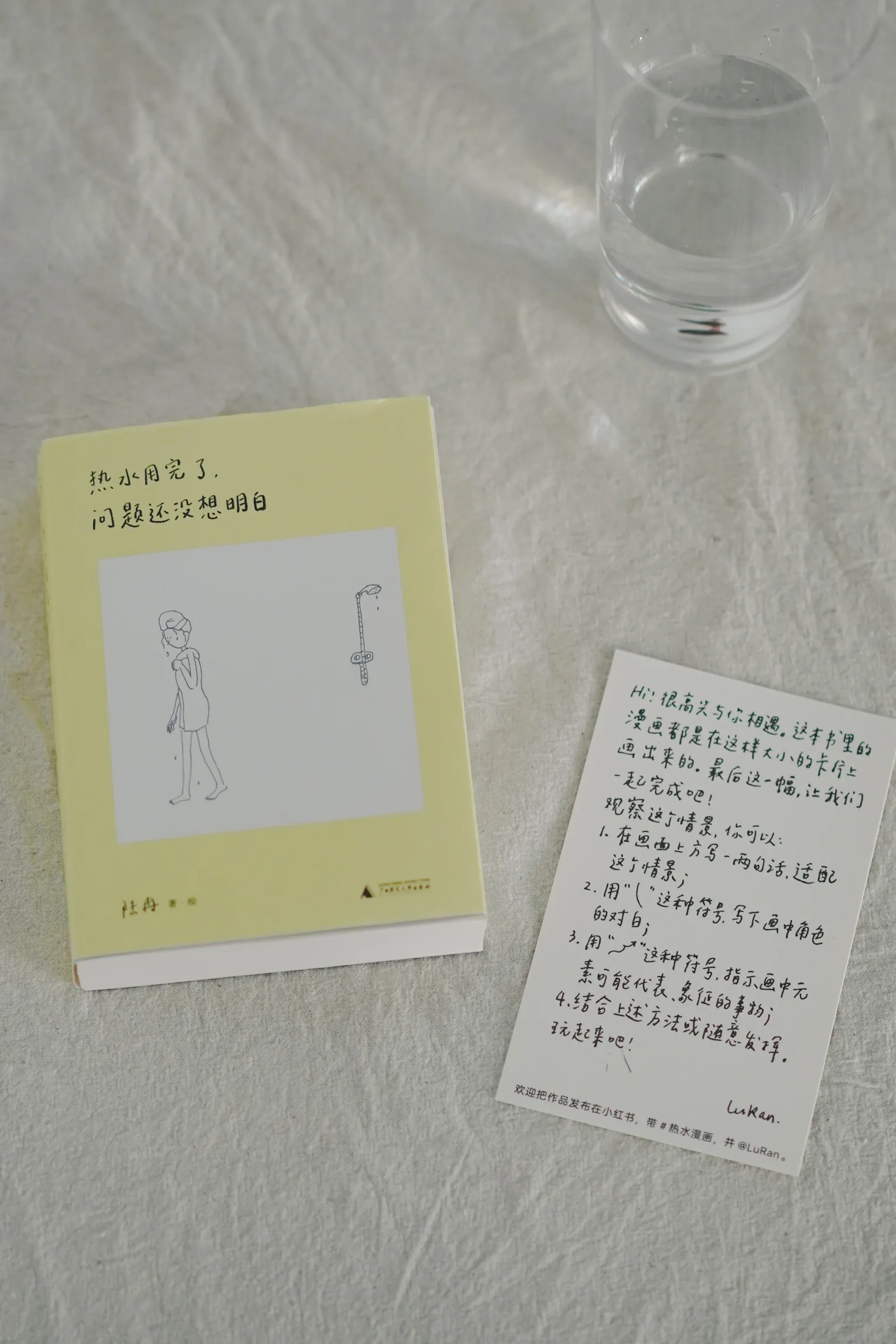 "一周",是她从2023年11月开始持续在公众号更新的系列。每日用一张8x13cm的卡片作画,后来整理出版为《热水用完了,问题还没想明白》。