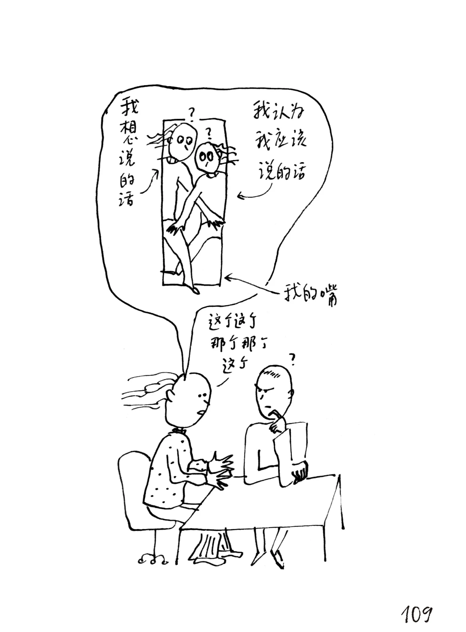 在现实中遇到前言不搭后语的窘境,漫画里可能就对应“两个人在一个很窄的门里要一起挤出来,但每人都挤出了一半”的画面。当她找到还原当时感受的办法,这次诊疗就算完成了。