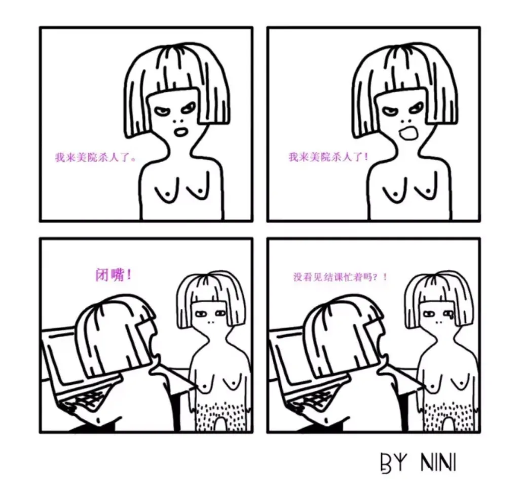 本科读服装设计时,她就以“毛毛的”形象记录美院生活,多是四格漫画,主打搞笑和真实。在《我来美院杀人了》获得10万+转发量后,她逐渐成为小有名气的漫画自媒体博主,随后跟随漫画界前辈阮筠庭,进修插画硕士。
