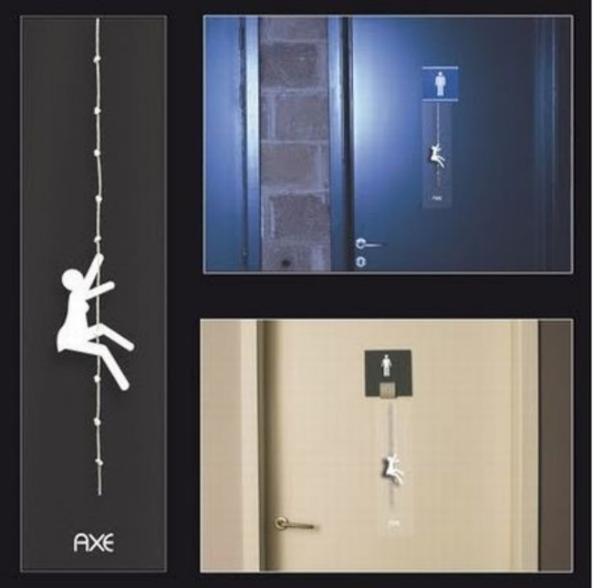 “嘿,女孩子们想尽一切办法就是要靠近我。”AXE香水广告。在常见的男士卫生间标识上加入一点变化,意图显而易见,当然,还有LOGO。
